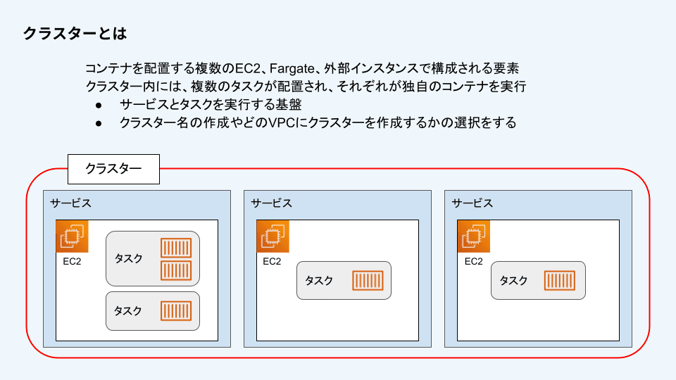 クラスターとは、後述する「サービス」と「タスク」を実行する基盤のことです。図で示すと赤枠の部分に相当します。